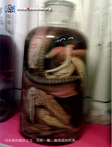 吃饭的地方也不叫饭店,三层的村屋,跟旁边的“握手楼”并无不同之处,入门处供着观音,客厅里摆了许多瓶瓶罐罐,除了药材就是药酒。店老板叫冯博禧,显然是当地的村民,40岁上下,典型的广州人生意人,很好笑口的样子。柜子上有他和陈开枝和一些不知名字的领导的合影,对联是“上食知味,福亦其中”。